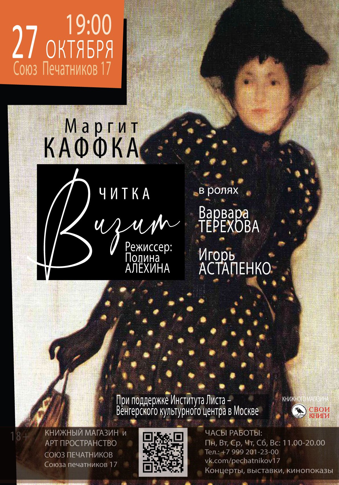 27 октября в 19.00 «Визит»— актеры Варвара Терехова (театр «ДРАМ.ПЛОЩАДКА») и Игорь Астапенко в постановке «Визит» воплотят в формате театрализованной читки рассказы Маргит Каффки, венгерской писательницы начала ХХ века, сохраняя поэзию авторского слога.