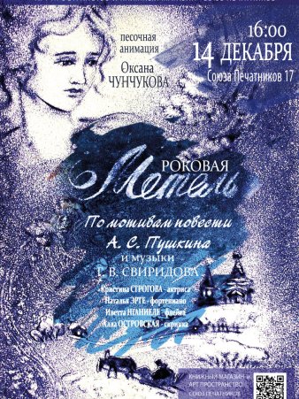 Мастер песочной анимации — Оксана Чунчукова, музыка Георгия Свиридова прозвучит в исполнении пианистки Наталья Эрте, скрипки Аллы Островской и флейтистки Иветты Нганиеле, текст Александра Пушкина будет читать актриса Кристина Строгова. Ждем всех с радостью! А мы подготовили для Вас очередной сюрприз. Какой - приходите и все узнаете!